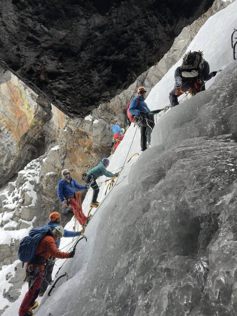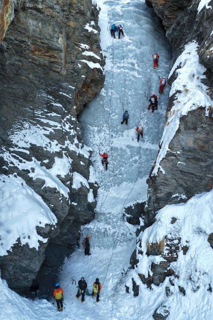 Très vite, la progression s’intensifie. Les participants s’attaquent à des cascades plus verticales, où l’équilibre, la précision des frappes et la gestion de l’effort deviennent déterminants. Chaque coup de piolet doit être juste, chaque appui solide. La moindre erreur se paie immédiatement, rappelant que la glace est un terrain aussi fascinant qu’impitoyable.