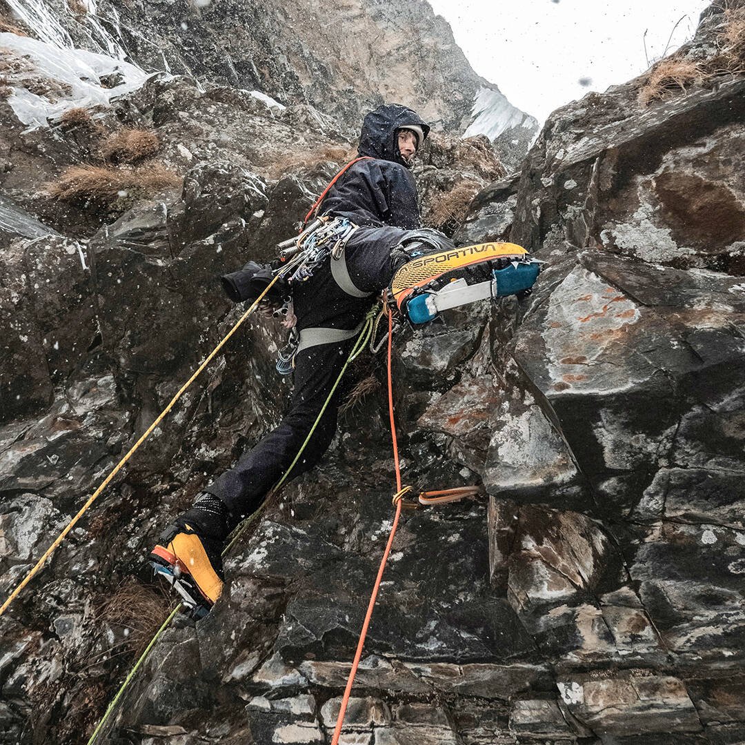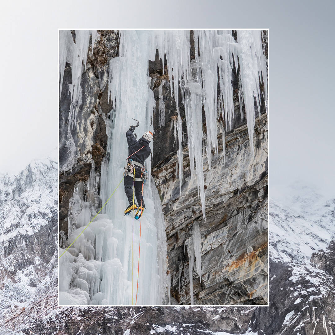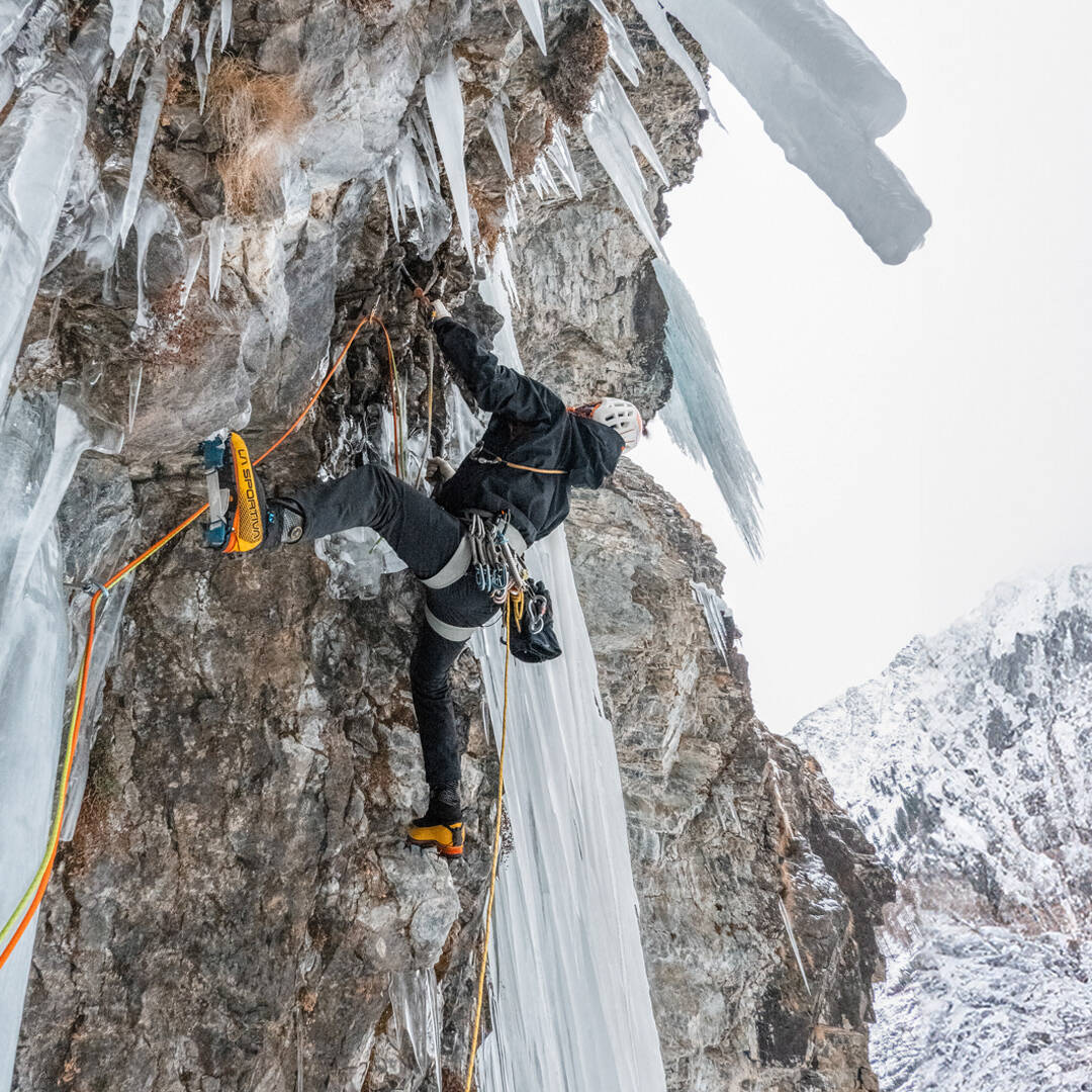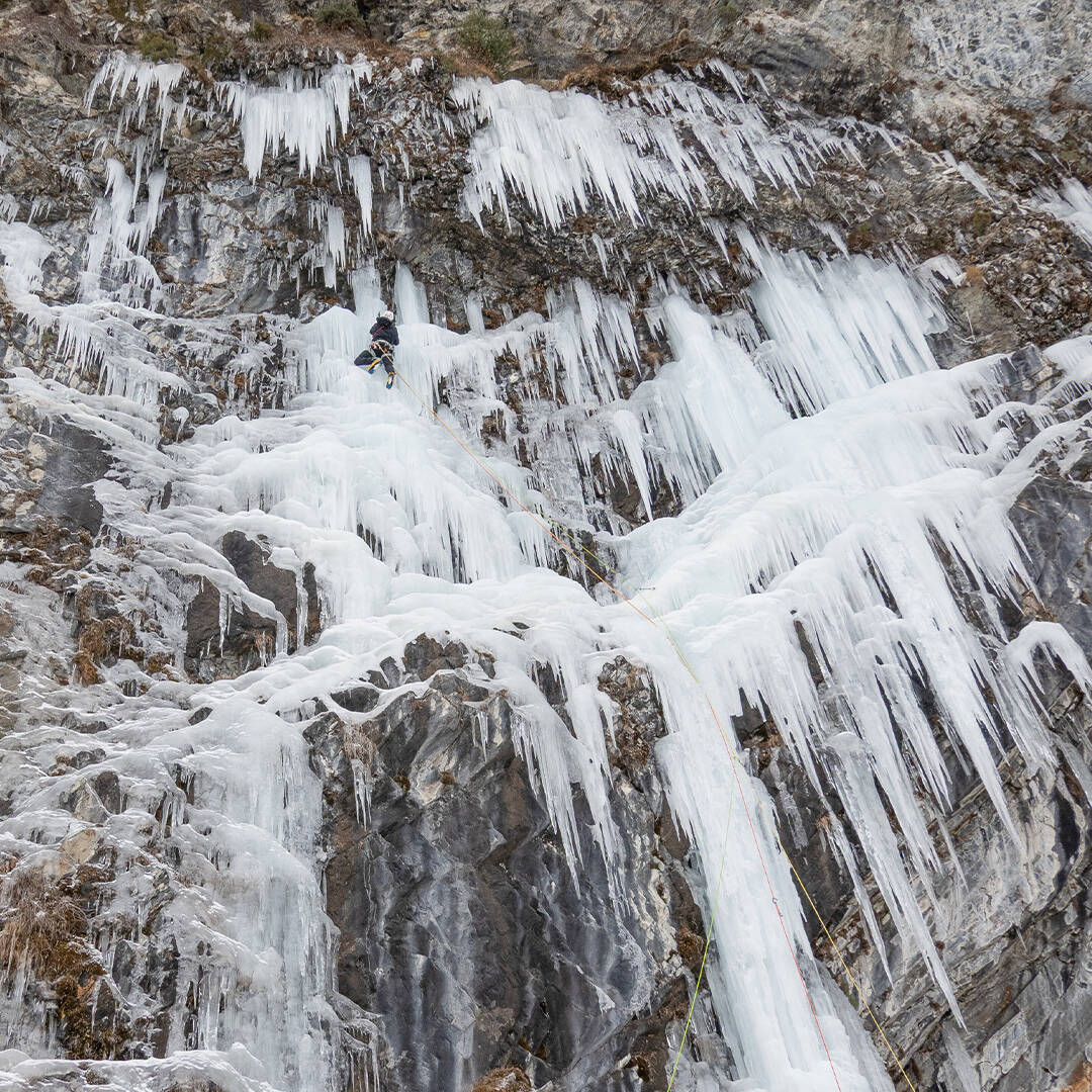 Longueur clé : quelques mètres de mixte déversant, physique et technique (M7), protégés par deux goujons permettant d’atteindre un glaçon suspendu. Relais sur une large vire équipée.